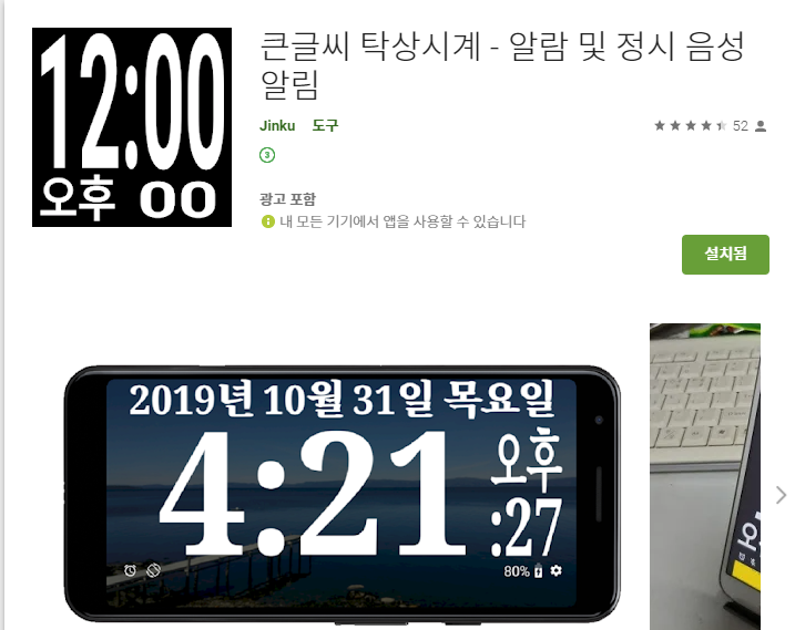 구글플레이에서 "큰글씨 탁상시계" 검색하면 그 많은 시계들 중 제일 먼저 보인다.
