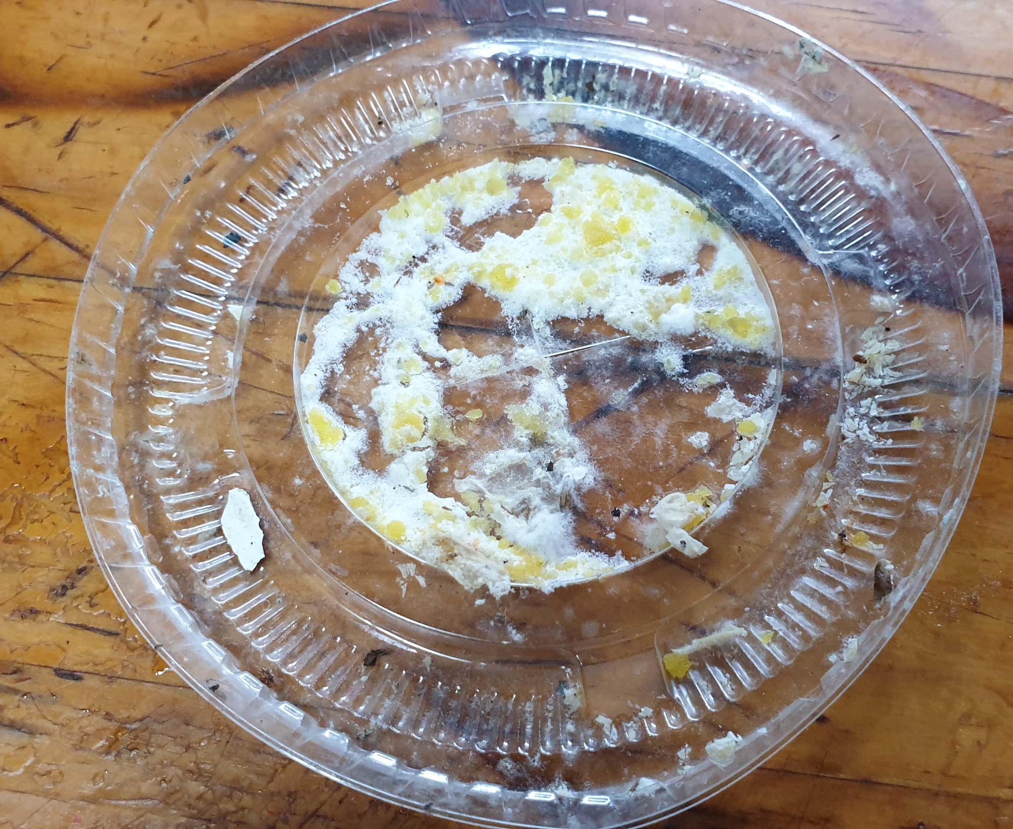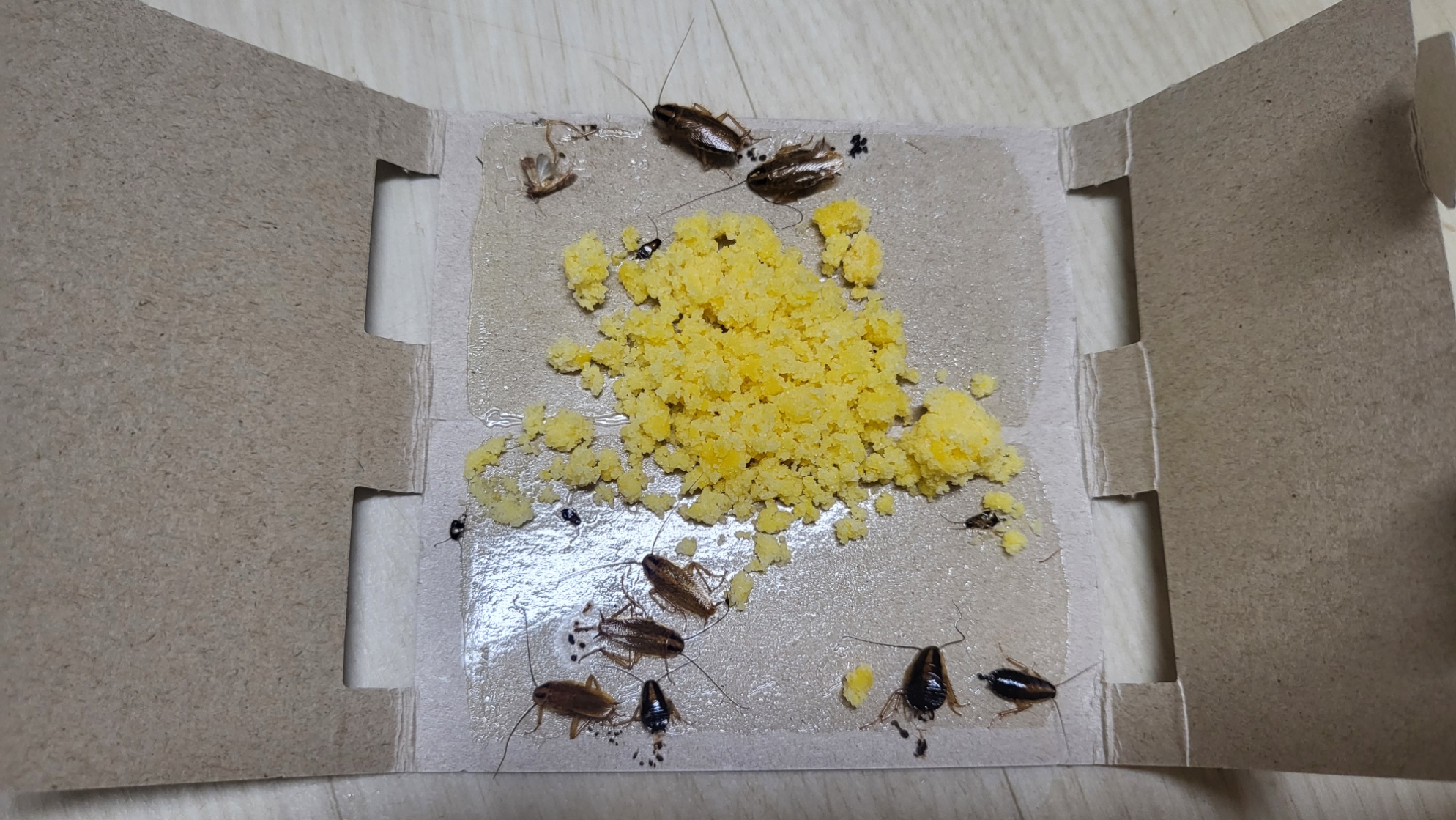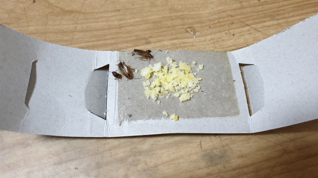 잘 섞어준 바퀴벌레 먹이를 나누어 담아 군데군데 놓아 두었다(어제 30일 오후에)