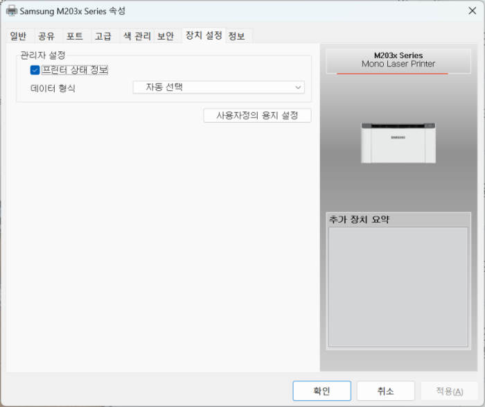 설치 완료후 속성에 들어가 보면 M203x Series 프린터가 잘 등록되어 있다.